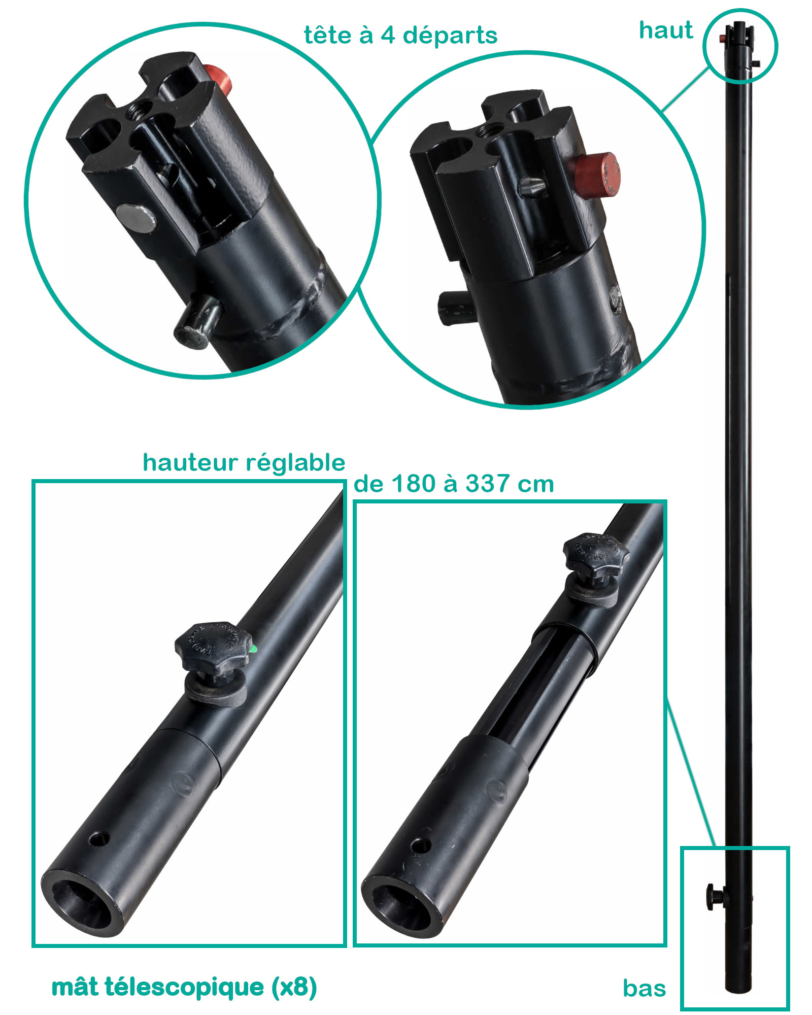 • 8 mâts télescopiques (hauteur réglable de 180 à 337 cm)