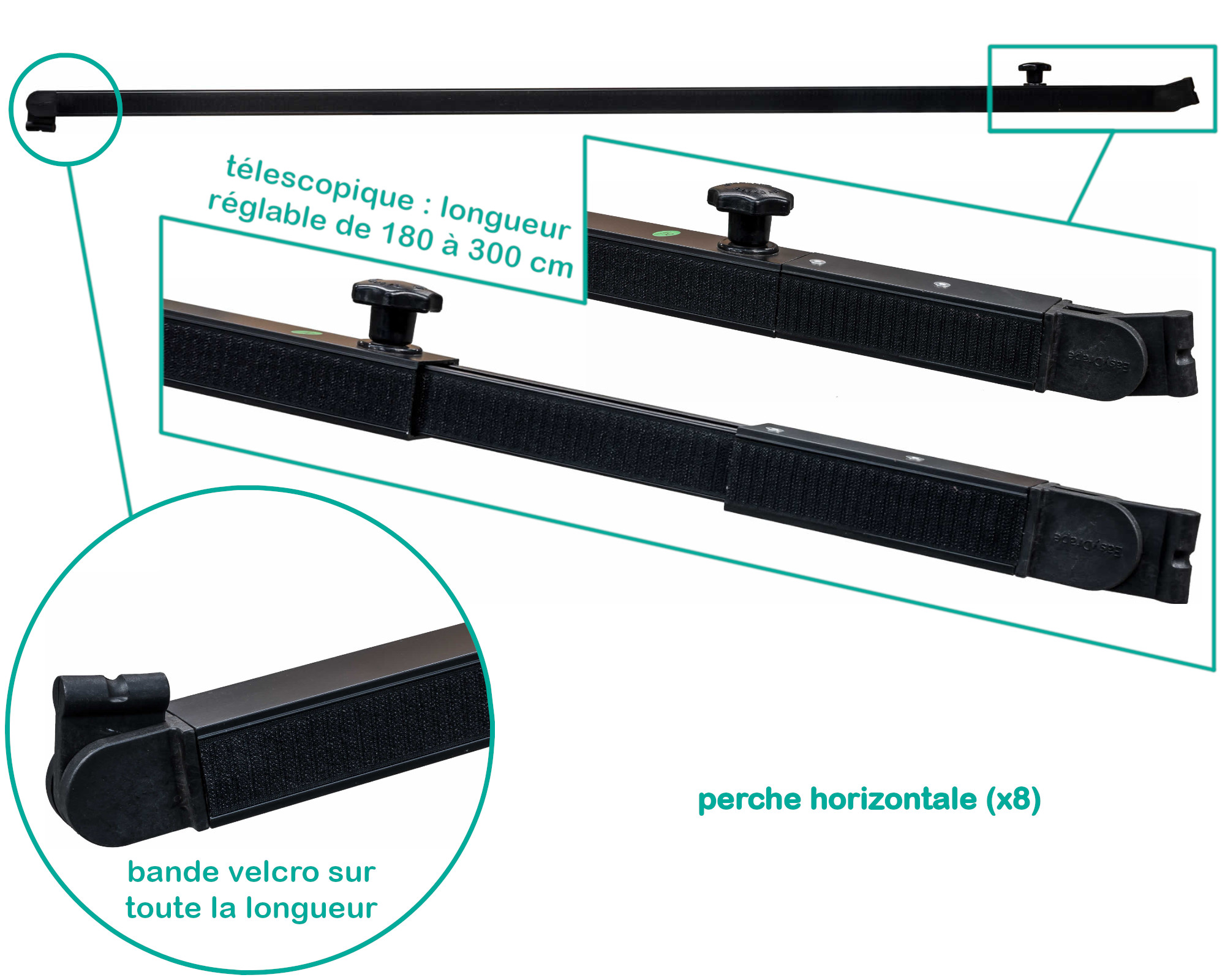 • 8 perches horizontales avec bande velcro (longueur réglable de 180 à 300 cm)
