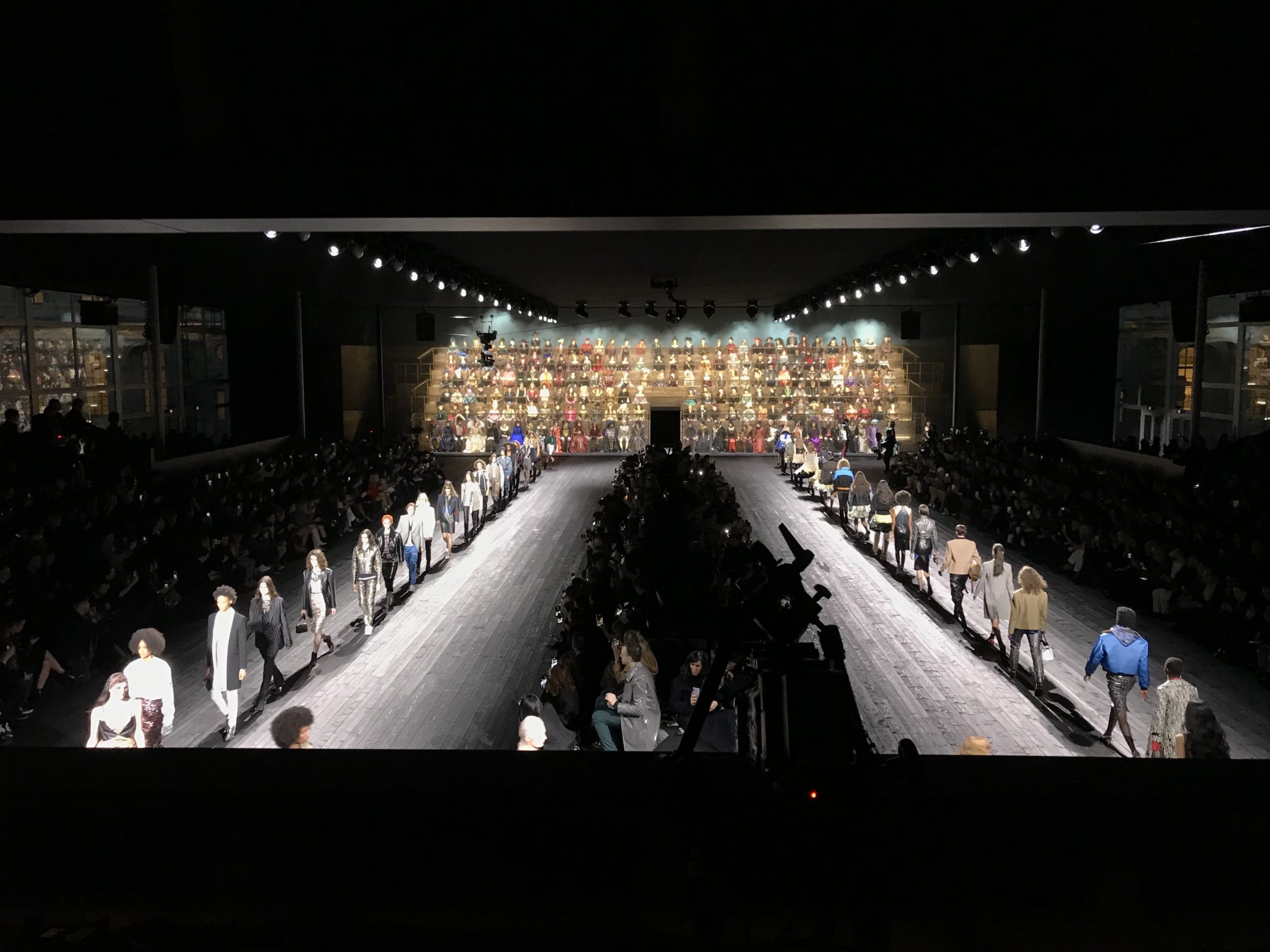 Les spectateurs étaient invités à prendre part à un véritable voyage dans le temps : une gigantesque assemblée de 200 personnes en costumes de différentes époques de l’Histoire de France se dressait ainsi face aux invités, retraçant l’évolution de la société et de son style vestimentaire du XVème siècle à 1950.